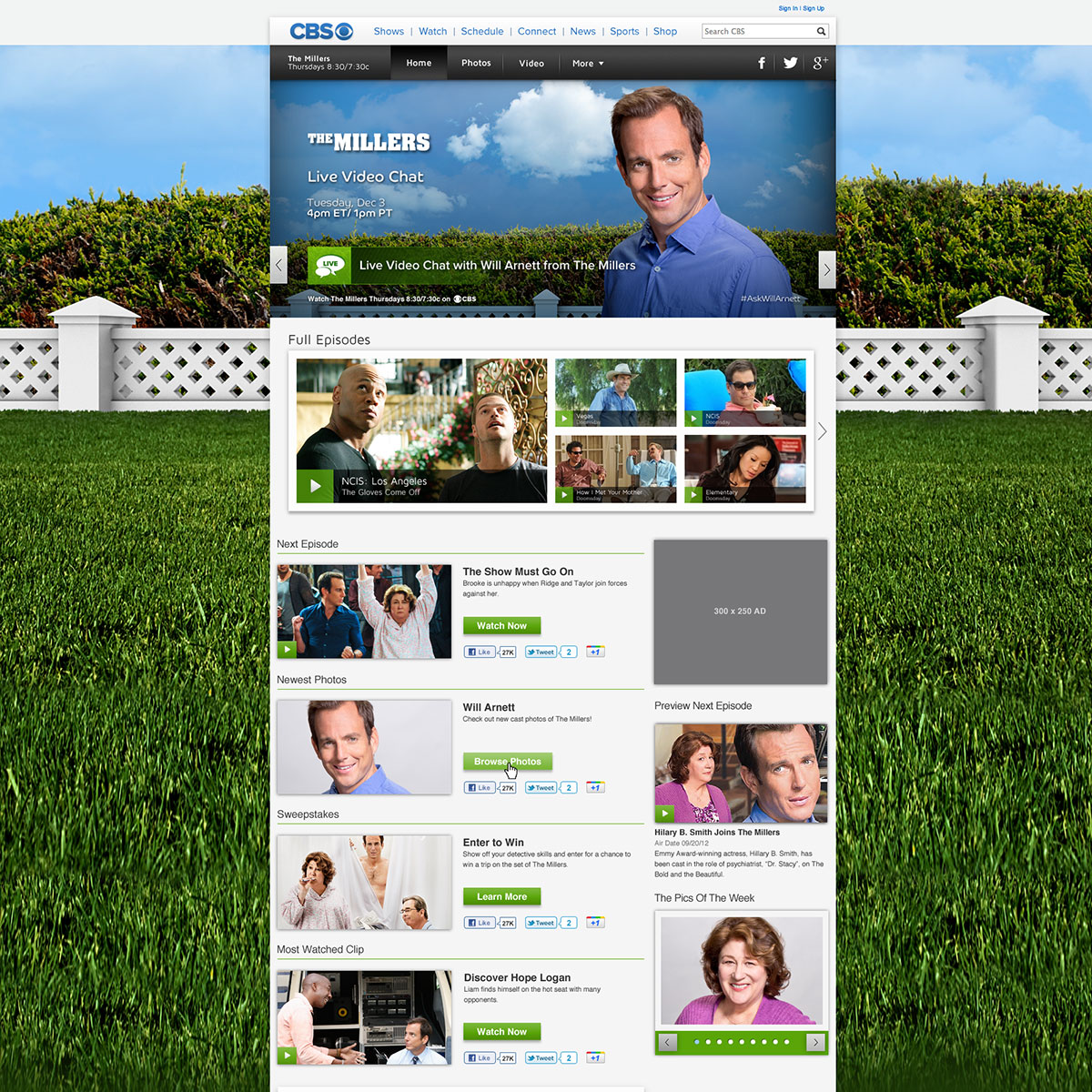 Design and Production for CBS's The Millers. Design of digital upfront promotional campaigns, including key art and TV screens. Full CBS page take-over.