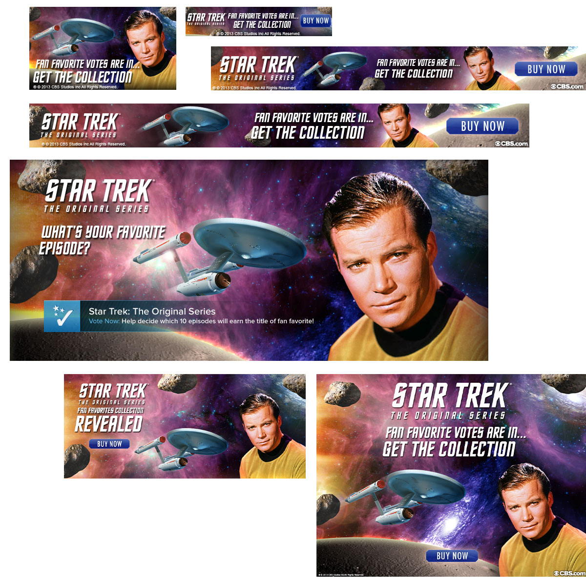 Design and Production for CBS's Star Trek App. Static banners and web site graphics. Design of traditional and digital promotional campaigns. Full page take-over and micro-sites.