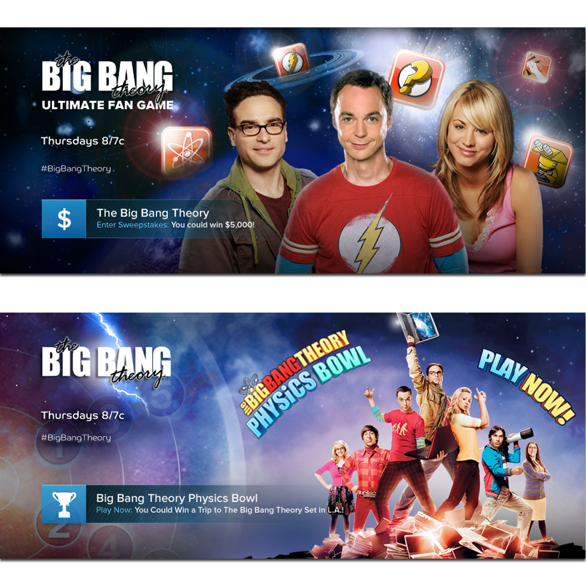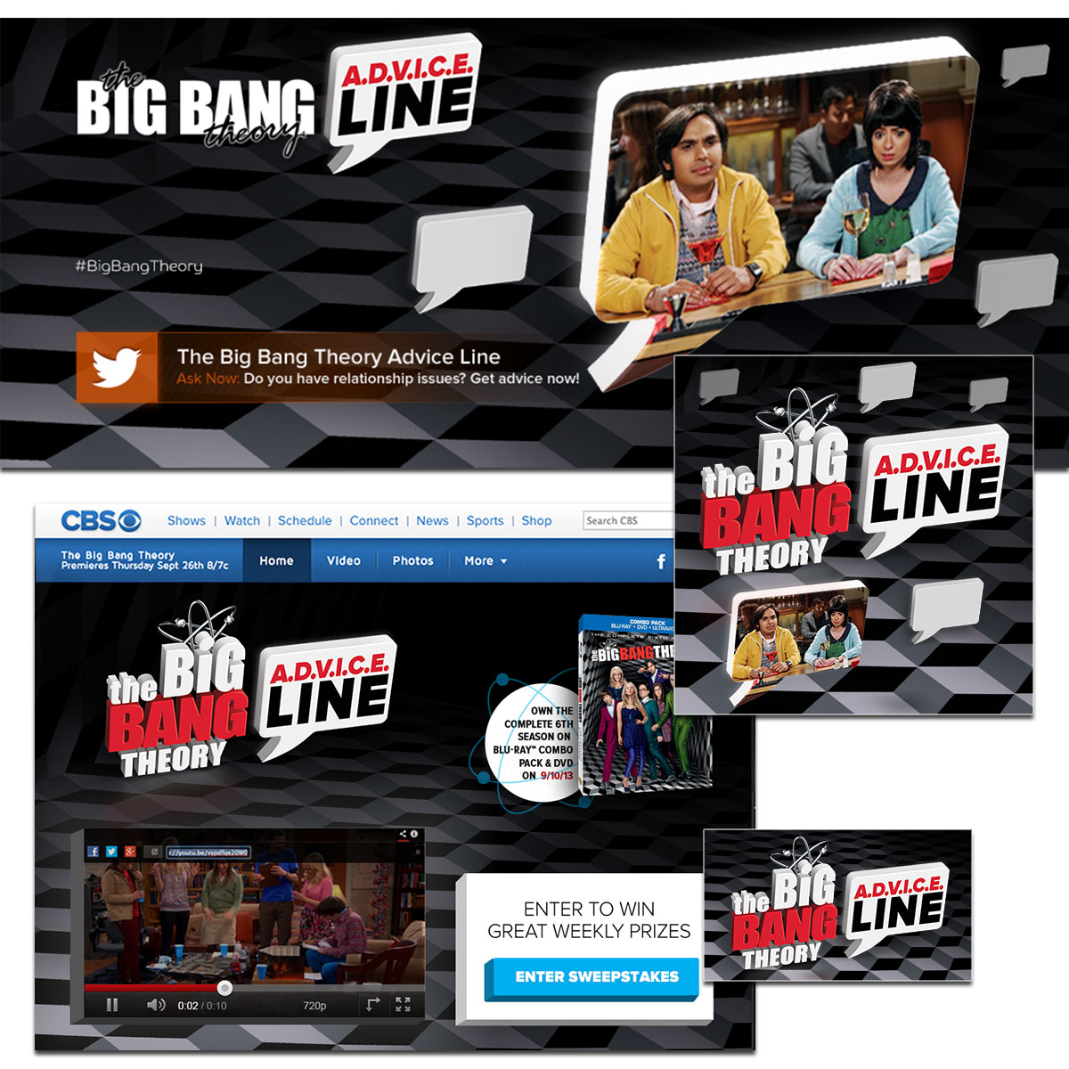 Design and Production for CBS's The Big Bang Theory series. Static banners and TV screens. Design of traditional and digital promotional campaigns. Full page take-over and micro-sites.