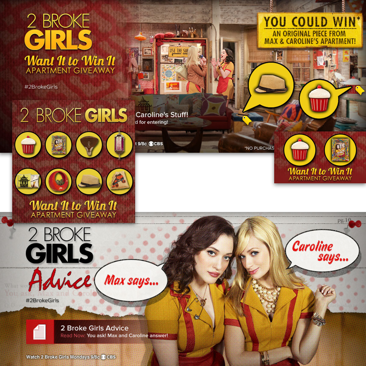 Design and Production for CBS's 2 Broke Girls series. Static banners and TV screens. Design of traditional and digital promotional TV campaigns. Full page take-over and micro-sites.