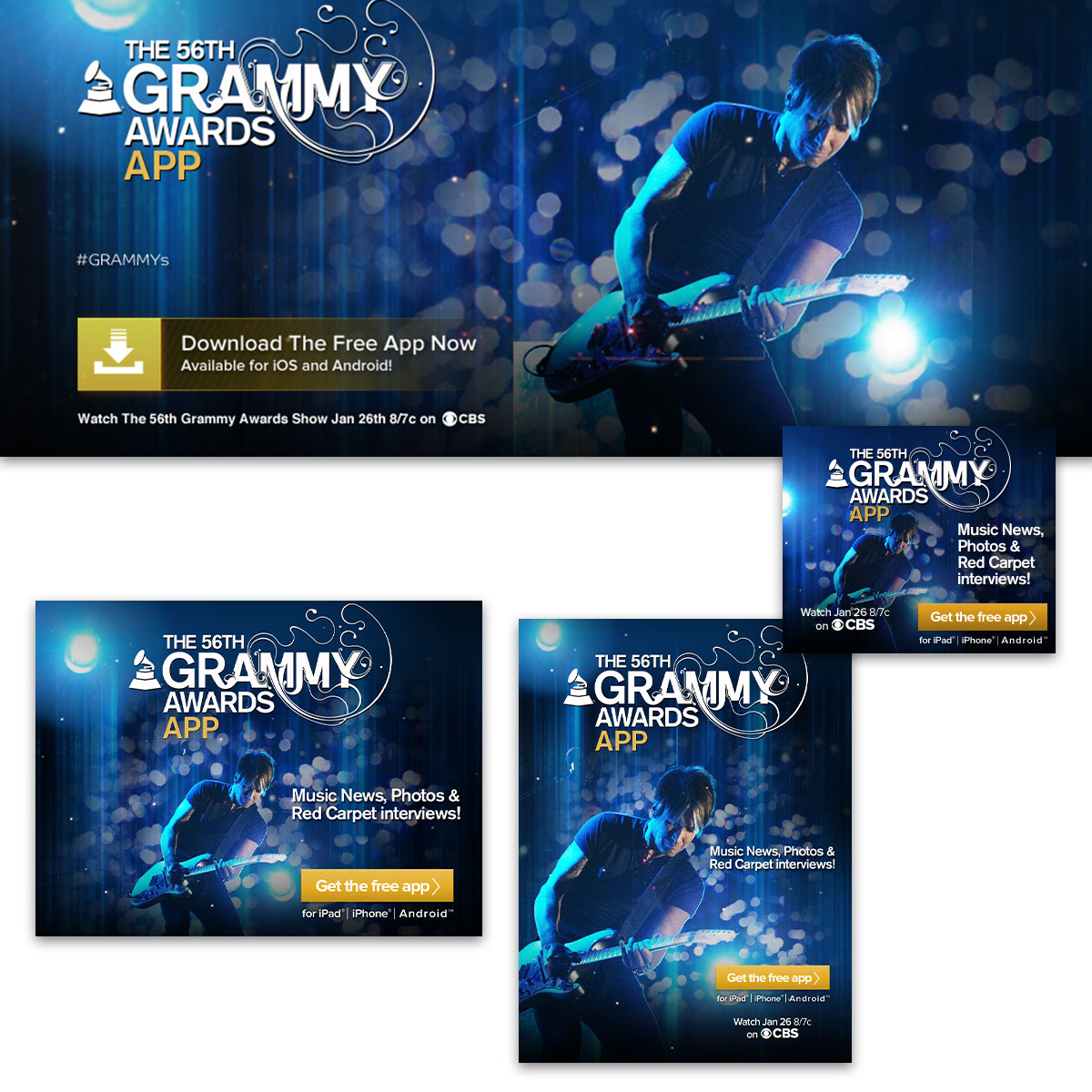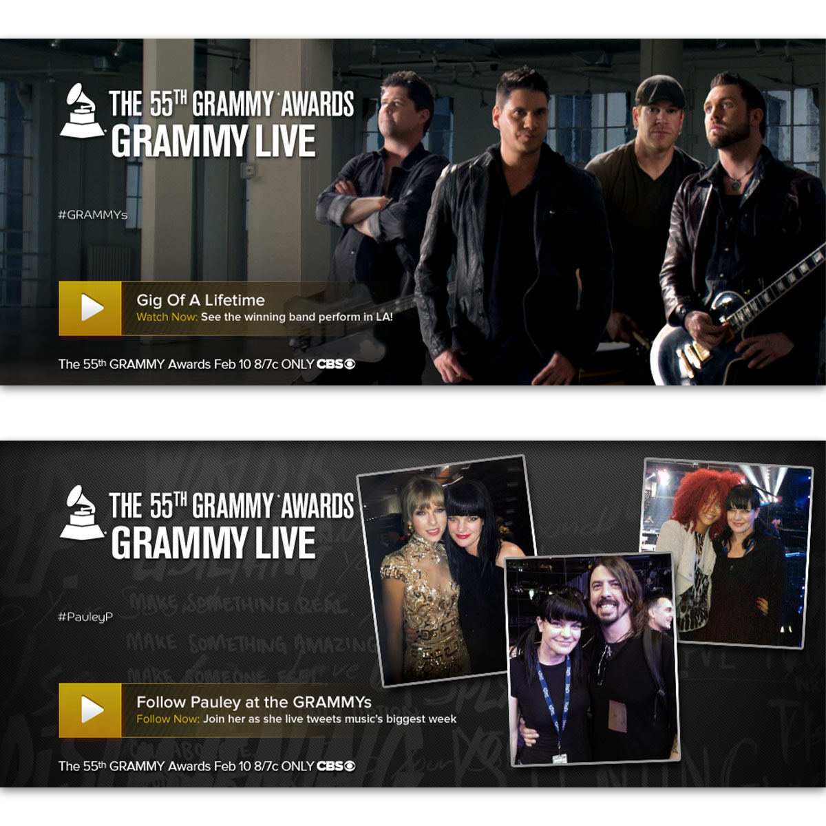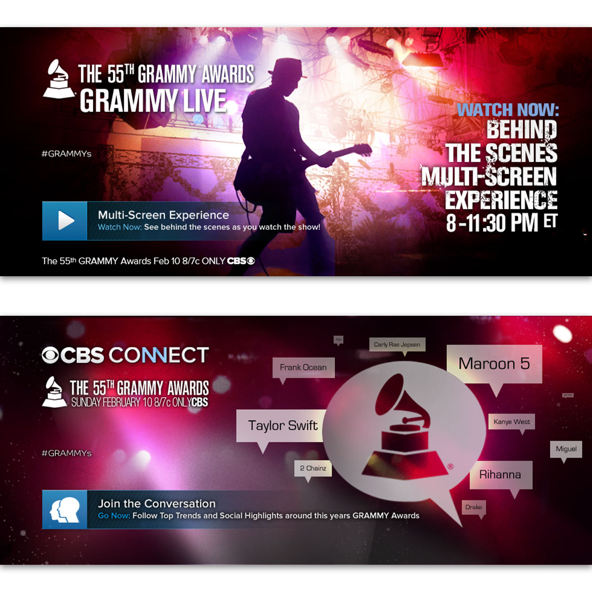 Design and Production for CBS's prentation of The Grammy Awards. Static banners and TV screens. Design of traditional and digital promotional campaigns. Full page take-over and micro-sites.