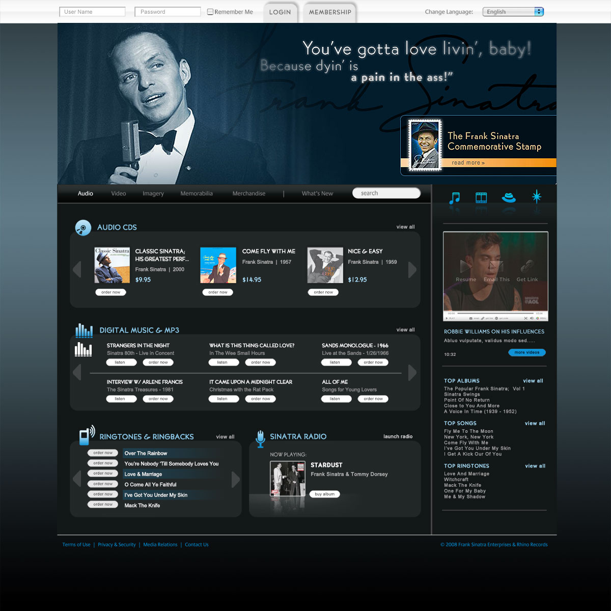 Design and Production for Sinatra web site. UI and web page layout. Design of animated page header. Full page take-over.
