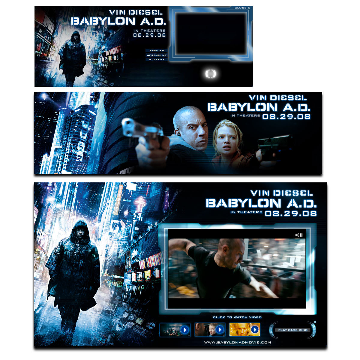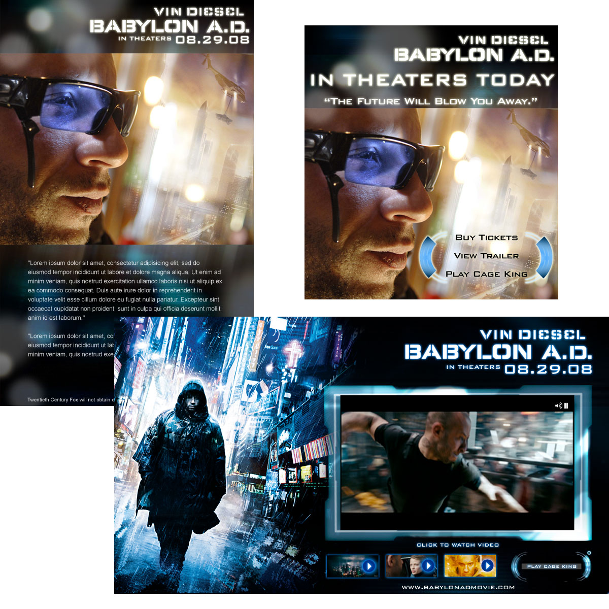 Design and Production for 20th Centtury's Babylon A.D. Flash ActionScript, HTML animated banners. Edit video to match flash animation and motion in After Effects. Design of theatrical and digital promotional campaigns. Full page take-over and micro-sites.